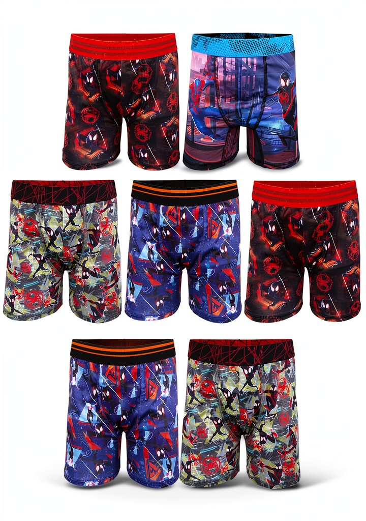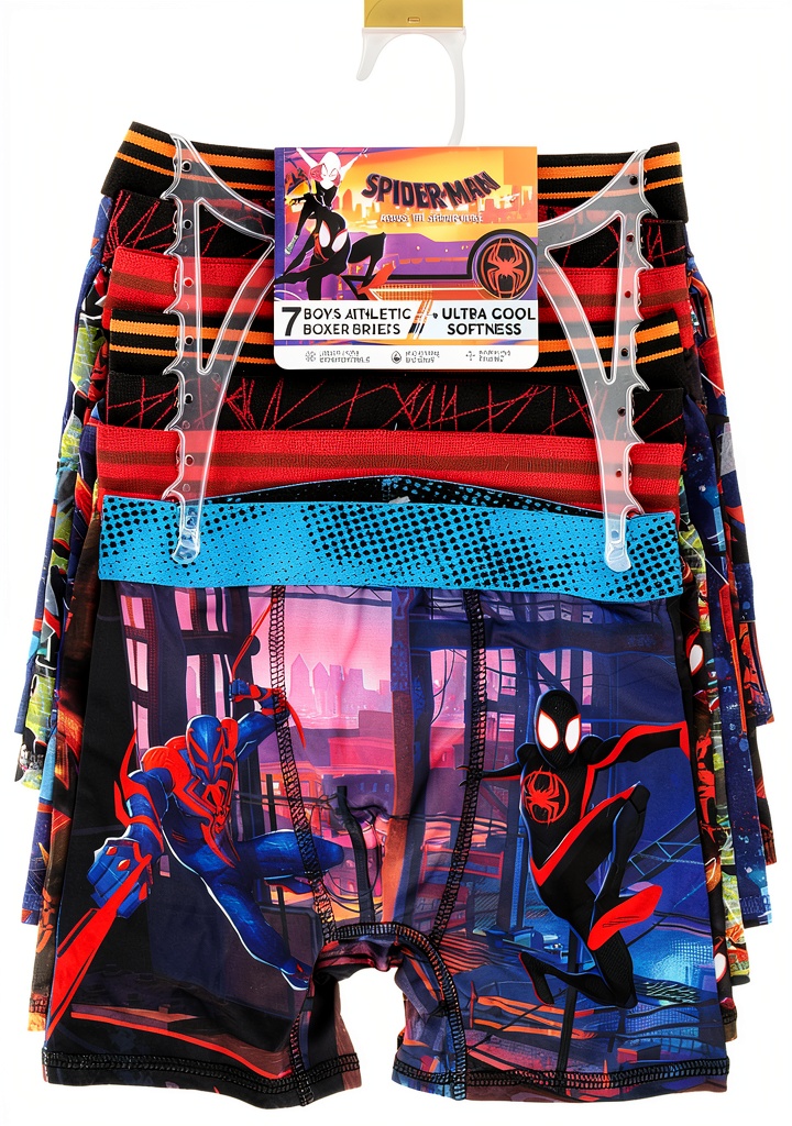 Handcraft Children’s Apparel presents officially licensed Spiderman boys boxer brief multipacks, designed for comfort and durability. These multipacks come in two main styles: 5-pack 100% combed cotton boxer briefs and 7-pack athletic boxer briefs made with Polyblend fabric featuring Coolcraft Technology for ultra-cool softness. Available in sizes 4, 6, 8, 10, and 12, each pair is tagless with a brushed waistband to prevent irritation. The product includes multiple Spiderman print options, ensuring variety and excitement for daily wear. Manufactured with attention to fit and quality, these boxer briefs rank highly in boys’ underwear categories, backed by positive customer reviews.
